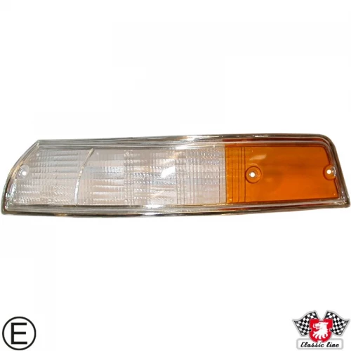 Lens for indicator with chrome rim, front, EU version, clear/orange, left, with E-mark