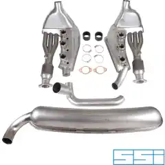 Exhaust set, Sport, with one Ø70 mm tail pipe and dual inlet, Ø41/Ø60 mm heat exchangers and catalytic converters. Made o...